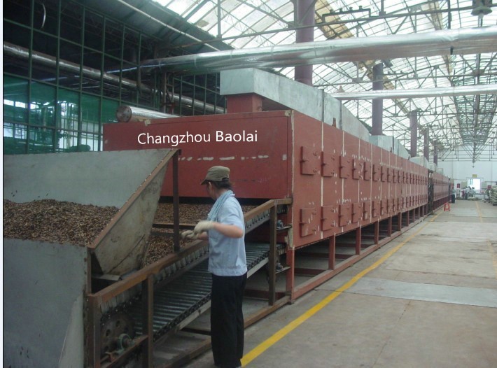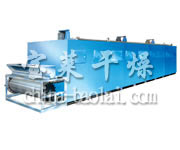 物料由加料器均匀地铺在网带上,网带一般采用12-60目不锈钢丝网,由传动装置拖动在干燥机内移动。干燥机由若干单元组成,每一单元热风独立循环,部分尾气由专门排湿风机排出,废气由调节阀控制,热气由下往上或由上往下穿过铺满物料的网带完成热量与质量传递的进程,带走物料水份。网带缓慢移动,运行速度可根据物料温度自由调节,干燥后的成品连续落入收料器中。上下循环单元根据用户需要可灵活配备,单元数量亦可根据需要选取。