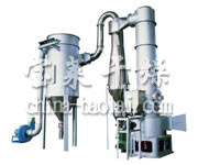 热空气切线进入干燥器底部,在搅拌器带动下形成强有力的旋转风场。膏状物料由螺旋加料器进入干燥器内,在高速旋转搅拌桨的强烈作用下,物料受撞击、磨擦及剪切力的作用下得到分散,块状物料迅速粉碎,与热空气充分接触、受热、干燥。脱水后的干物料随热气流上升,分级环将大颗粒截留,小颗粒从环中心排出干燥器外,由旋风分离器和除尘器回收,未干透或大块物料受离心力作用甩向器壁,重新落到底部被粉碎干燥。