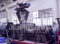 干粉通过螺旋输送机、皮带机或人工搬运进入提升机的原料仓,由斗式提升机将原料粉末送人振动式过度料仓,经过定量加料装置将物料均匀地加入变频式强制喂料机,对物料进行脱气预压缩,经预压缩的物料被压人两个相对的压辊中间进行压实,被压实的条片物料自动脱槽后进入破碎,被粉成大小不均的颗粒,然后进入双刀造粒机进行修整,修整后的颗粒通过分筛,产品颗粒经过打包或用输送机输入成品料仓,筛分下来的粉状物料经回料装置输入原料提升机,进行二次加工。